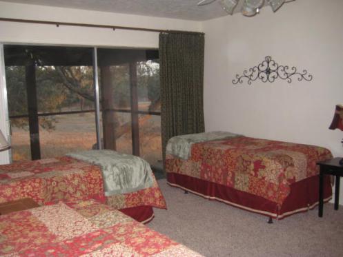 This room sleep 4 comfortably, with an additional bed as a roll out trundle, for a total of 5 people. This bedroom has access to an adjoining full bath and a screened porch, shared with the Belle Starr bedroom.